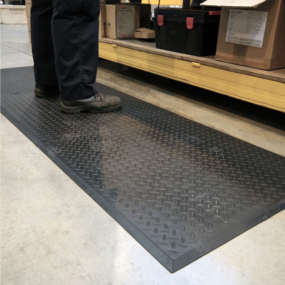 A heavy-duty rubber mat that provides a comfortable standing surface for operatives.It comes as interlocking modules for long runs, or as a single workstation mat. It is resistant to oil and grease making it ideal for food production areas or in any catering business. The diamond patterned surface provides underfoot grip, and its hard-wearing rubber ensures a long life in normal use. This mat is ideal for high temperature environments